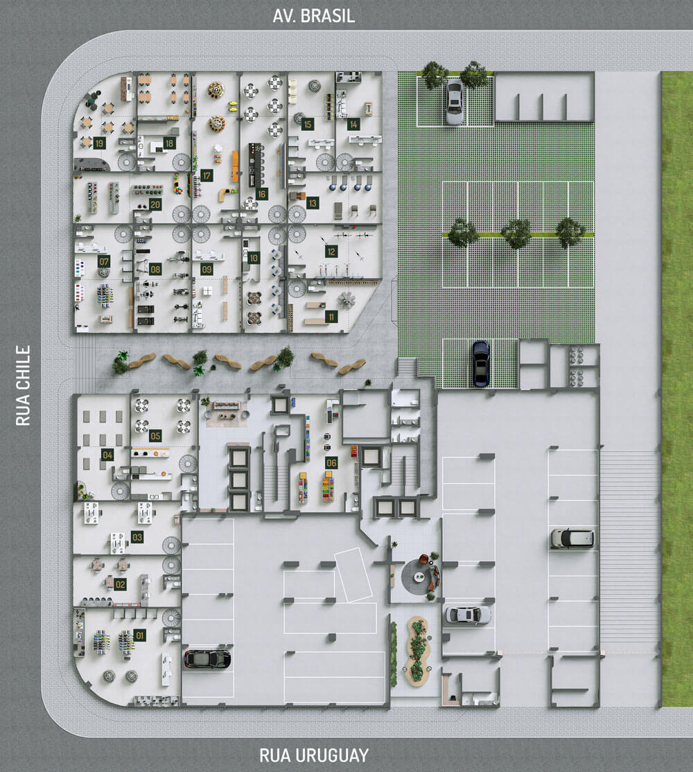 • Open Shopping com 20 lojas térreas + mezanino;